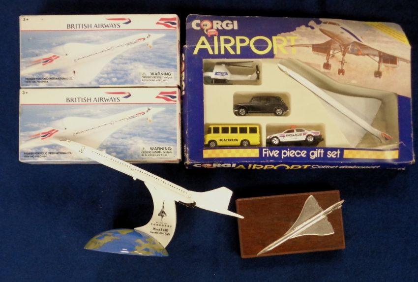 Aviation models, Concorde, 'The Spirit of Concorde' 50th Anniversary scale model with Concorde on globe stand with official insignia, No 1114 (unboxed), sold with a Corgi Juniors five piece Airport gift set, no 3125, in original box which includes a Concorde model aircraft, two unopened Premier Portfolio International boxed Concorde sets, No FPCON64 and a further metal model of Concorde on small wooden plinth (some minor faults, gen. gd)