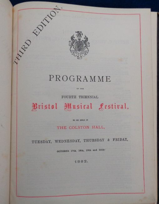 Entertainment, Bristol Musical Festival 1882, a bound volume of programmes and libretti for the Fourth Triennial Music Festival at the Colston Hall with folded seating plan. Contains 12 autographs of performers and 10 of the committee. Performers’ autographs include the conductor Charles Hallé, Emma Albani-Gye, Zelia Trebelli, Joseph Maas, Charles Santley, Edward Lloyd, Janet Patey, etc (gd)