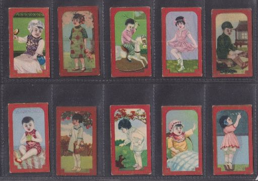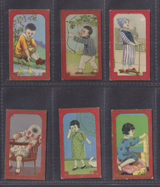 Cigarette cards, China, 46 unbranded cards Children's Games with red border fronts, backs written in Chinese and translate as Jokes (small amount of duplication, fair/gd)
