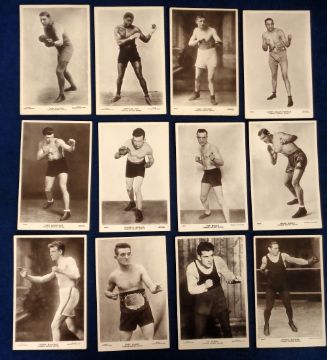 Boxing postcards, a collection of twelve photographic postcards from the Beagles Famous Boxers Postcard Series, Jess Willard, Battling Siki, Alex Ireland, 'Gipsy' (Billy) Daniels, Ivan Laffineur, Russell Whalen, Ted Moore, Frank Moody, Mickey Walker, La Barba, Elky Clark & Tommy Milligan (some with slight faults, a few with annotations to backs but mostly gd) (12)