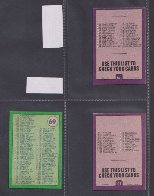 Trade cards, A&BC Gum Football, 3 unmarked Scottish checklists, 1971/72 Purple backs (2, 1-115 & 74-144) plus 1974/75 green back 1-132 (unmarked, gd/vg), 1966 World Cup Stamps (2, F Albert, R Flowers (as singles)), A&BC All Sport series (7), numbers 6 9 11 13 16 62 85 (gd/vg)