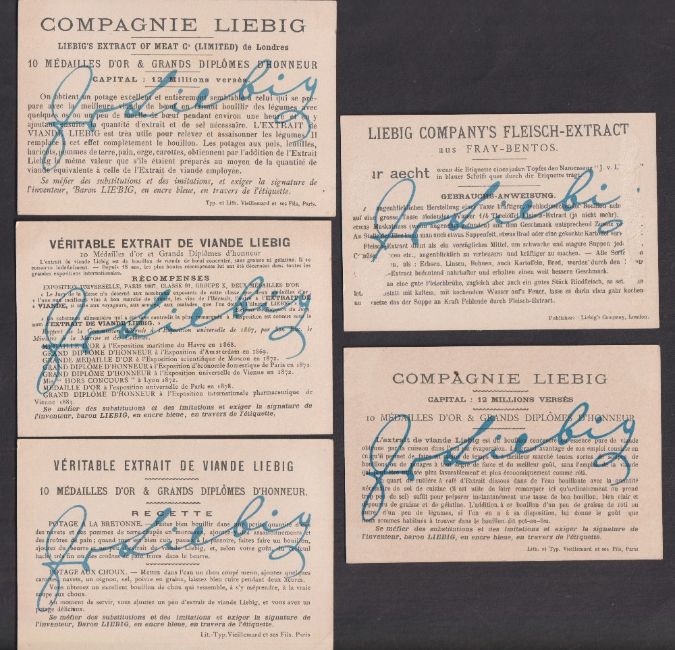 Trade cards, Liebig, Harlequin Costumes in Quarter Moon, Blue background, ref. S148A, five different cards, 4 French editions & 1 German (German issue with some back damage, others gd) (5)