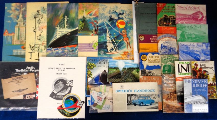 Transport, a small selection of transport related items inc. six Ian Allan booklets on Railways inc. The ABC of LNER Locomotives, The ABC of Southern Locomotives, ABC of British Railway Locomotives No 2 etc, London & South West Railway Instructions Booklet on the issue of Season Tickets 1917, Titans of the Track booklets for LMS, LNER & Southern Railways, Cortina's Owners Handbook, selection of travel tickets, 5, 1960's Russian Shipping Menus, NASA Shuttle Mission STS-45 Press Kit etc (mixed condition, some with faults, fair/gd)