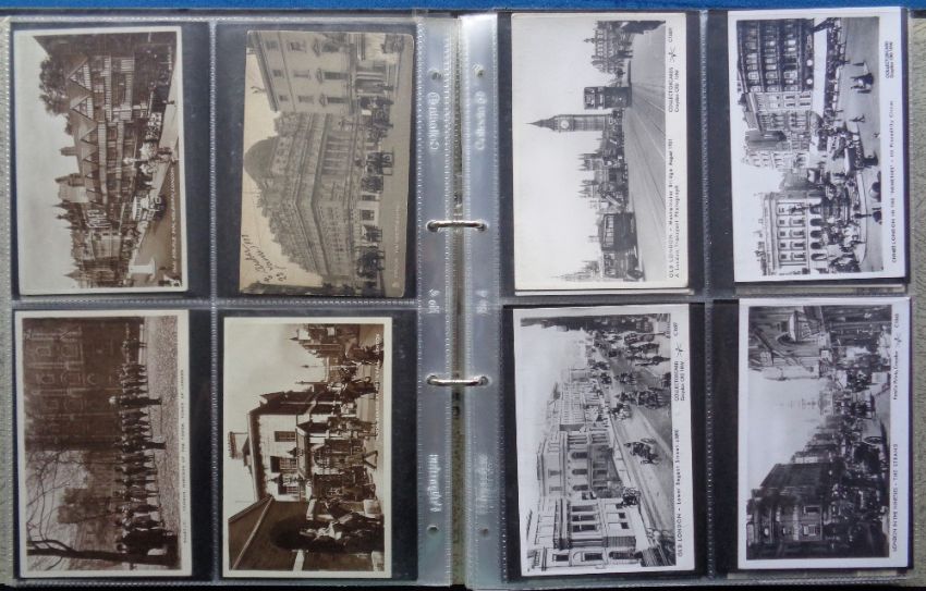 Postcards, London, a mixed age collection of approx. 155 cards of mainly Central London, with a few UK Royalty inc. Edward VII funeral procession. RPs include Cenotaph (many different), statues, aerial view of Bank of England, Thames views at Barnes, Kingston, Mortlake High St. Also a few Collector Cards, and Pamlins (mixed condition)