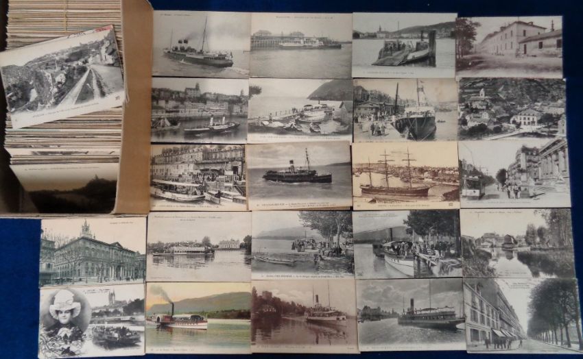 Postcards, a good mixed foreign selection of over 600 cards, with a collection of French topographical (approx. 440) inc. town and village scenes, many street scenes, canal, shipping (ferry, paddle, excursion), docks, ethnic, ways of life, rural, costume, good Transport, horse racing (courses). Also approx. 200 printed cards of India with towns, villages, traders, costume, ethnic, buildings, streets etc (mixed condition)