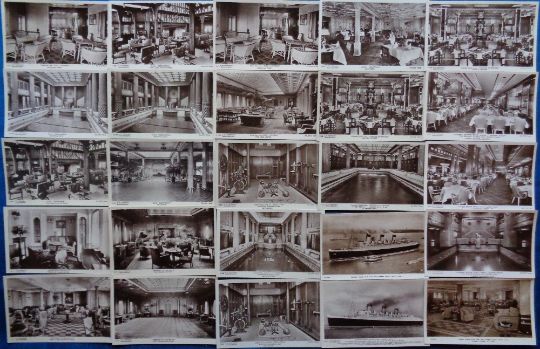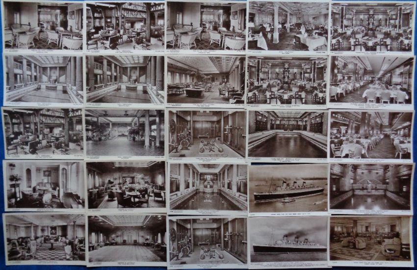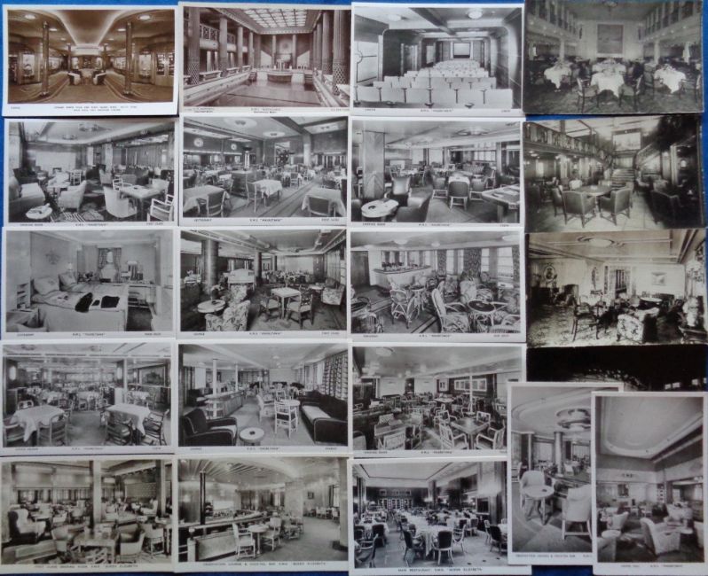Postcards, Shipping, a collection of 46 RPs of interior views of liners published by C.R Hoffman of Southampton and others. Ships include Empress of Australia, RMS Berengaria, Homeric, Leviathan, Queen Elizabeth, Mauretania, Aquitania, Empress of Britain and Queen Mary etc. Interiors include gym, smoking room, cabin diners saloon, Olympian pool, grill room, veranda, cafe, first class lounge etc (gd/vg)