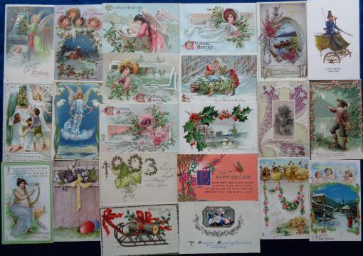 Postcards, a collection of 320+ cards to include various Tuck greetings, Tuck's Charles Flower cards and a selection of 28 heraldic cards. Subjects include pretty ladies, rabbits, angels, anthropomorphic, chicks, date cards etc. A colourful selection (gen gd)