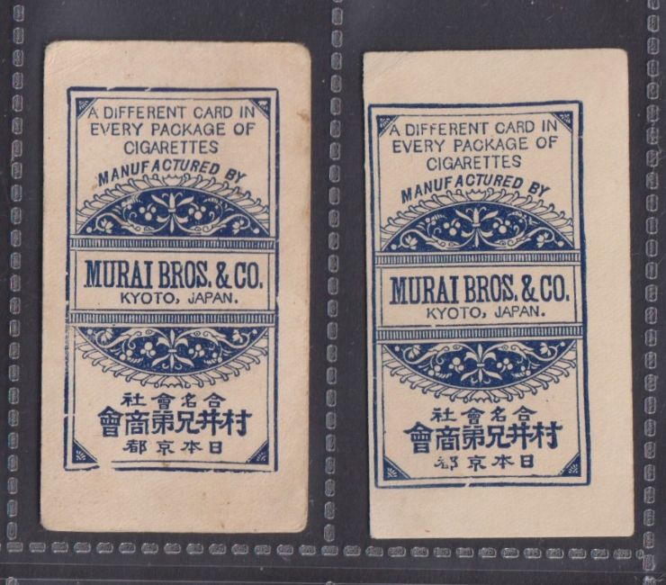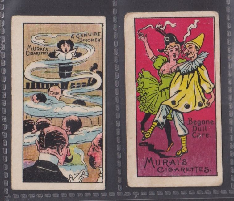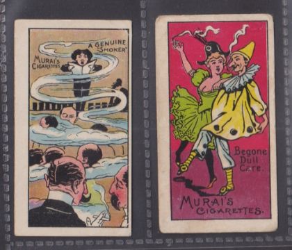 Cigarette cards, Japan, Murai Bros., Phrases & Advertisements (Back in blue, 'A Different card in every packet…') two cards, 'Begone Dull Care' and 'A Genuine Smoker' (just gd) (2)