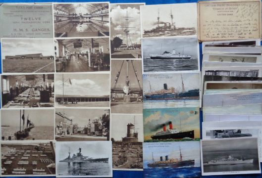 Postcards, Shipping, a very mixed shipping collection of approx. 100 cards, with Med Summer Cruise for 1932, HMS Resolution (map), RMS Amsterdam (RP), RMS Briton, Europa (liner), Majestic (RP), Castalia (Anchor line), Arabic (White Star), PS Glen Gower (RP), HMS Nelson, Mauretania, opening Royal Edward Dock Avonmouth 1908, HMT Georgic, Bremen, St Seiriol. Also seamen in uniform (RPs), Naval personalities, Navel Life (mixed condition)