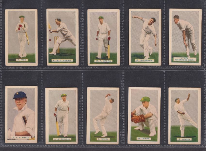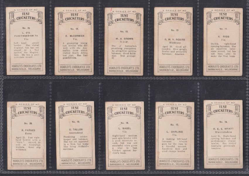 Trade cards, Australia, Hoadley's, Test Cricketers (37/40, missing nos 1, 5 & 7) (most with toning, slight staining, slight marks etc, fair/gd) (37)