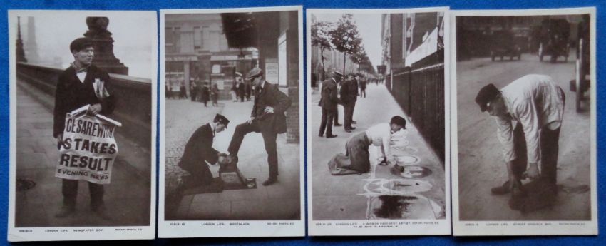 Postcards, London Life, a Rotary published selection of 4 RPs of the London Life series. Includes nos. 10513-3, 5, 15 and 28. The Street Orderly Boy, Newspaper boy, Bootblack and Woman pavement artist (gd)