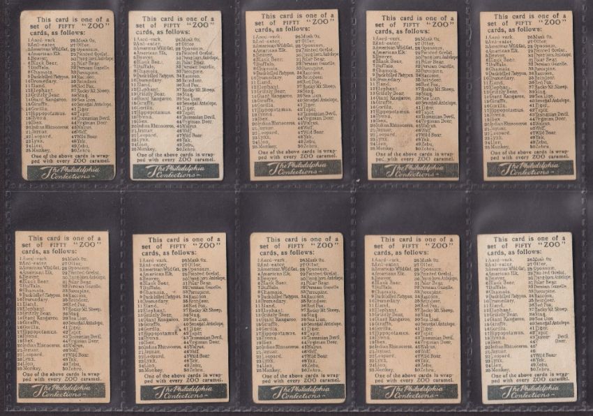 Trade cards, USA, Philadelphia Carmel Co, Wild Animals (Zoo Cards) (set, 50 cards) (some with marks & slight faults, a few fair, gen. gd)