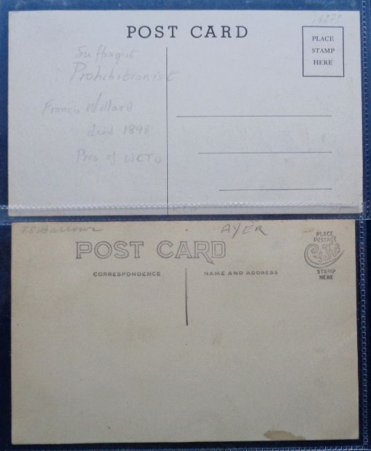 Postcards, Suffragette, an RP of 'The First Suffragette in Ayer' with a notice positioned above the suffragist. Ayer is a town in Middlesex County Massachusetts, and is noted for its railroad and historic Main Street. Also shows a 4 wheeled cart being 'pushed' by a horse, with attached sign to the cart 'Some Push Ayer Board of Trade'. Sold with a portrait of Suffragist and Prohibitionist Francis Willard president of the Women's Christian Temperance Union (WCTU) (2) (gd)