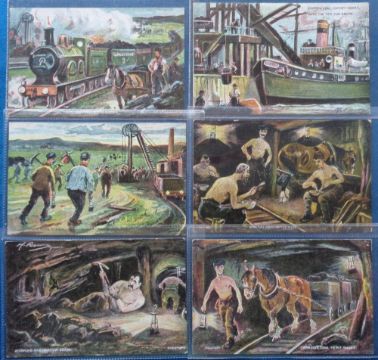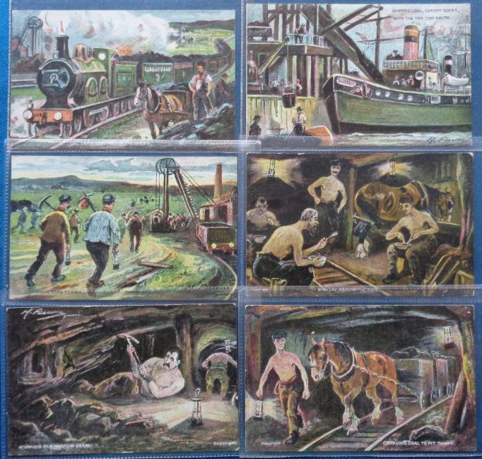 Postcards, Mining, a set of 6 cards illustrated by H Fleury inc. shipping coal Cardiff Docks with the ten ton shute, coal train leaving for the Docks, carrying coal to pit shaft, midday meal in the mine, working in a narrow seam, miners going to work (mainly gd)
