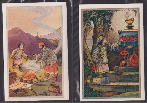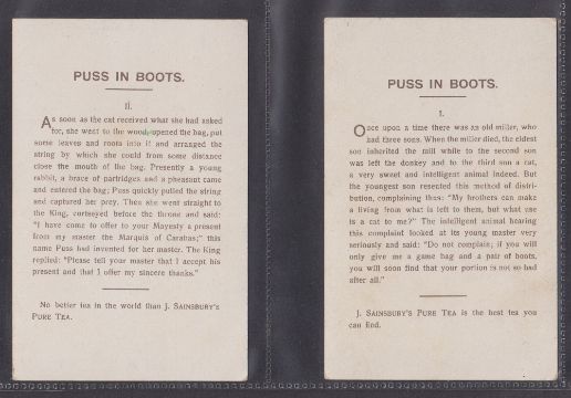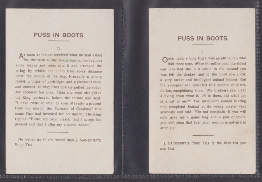 Trade cards, 2 sets, Sainsbury's Puss in Boots (P sized 6 cards), plus a similar style anonymous set of 6 cards 'Aladdin & the Wonderful Lamp' (gen gd)