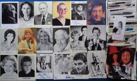 Autographs, a selection of approx. 140 late 20thC signed photographs to include Sheila Hancock, Richard Briers, Ernie Wise, Lynda Bellingham, Jenny Seagrove, Peggy Mount, Stephen Fry, Nigel Hawthorne, Marcia Warren, Ian Carmichael, Barbara Windsor, Alan Bennett, June Brown, Kenneth Connor, Kim Hartman, Robert Powell etc (gd)