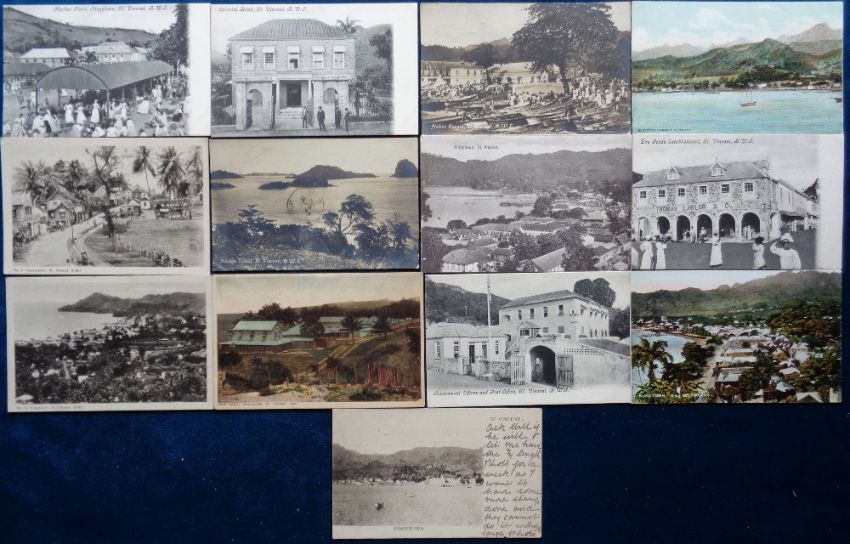 Postcards, St Vincent, 13 cards to include Youngs Island, Georgetown, Native Canoes, Kingstown, Government Offices and Post Office, Dry Goods Establishment etc (gd)
