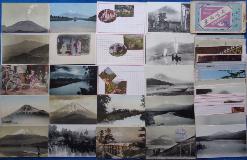 Postcards, Japan, a collection of 100+ cards of Japan with 6 Exhibition cards from Taisho showing crowds, buildings, decorated Dignitary, Hasse, Rokuri-ga-hara Shinshu (village and carting logs), Tea House Hikone Park, View of Yumoto Hakone, Monument of Nanto Tokyo, Nijiu Bridge Tokyo. Also many street scenes of Mount Fuji and a few illustrated views etc (mixed condition, fair/gd)