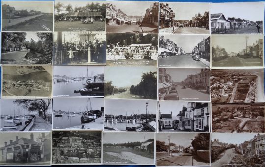Postcards, a collection of approx. 85 cards of mainly Hampshire coastal towns and villages with RP's of Highcliffe village, Bungalows Nash Farm Highcliffe, aerial view of Hythe, Shop front Clock Tower Highcliffe, Quay Hill Lymington, Harbour, High St Lymington, aerial view of Lymington, Ford New Milton, Milton Hotel, and Tea Gardens, Bay View Road Southbourne, Irving Road Southbourne All Saints Garden Fete Southbourne, Carrington Road Milford on Sea, and the village, Mudeford etc (gd)
