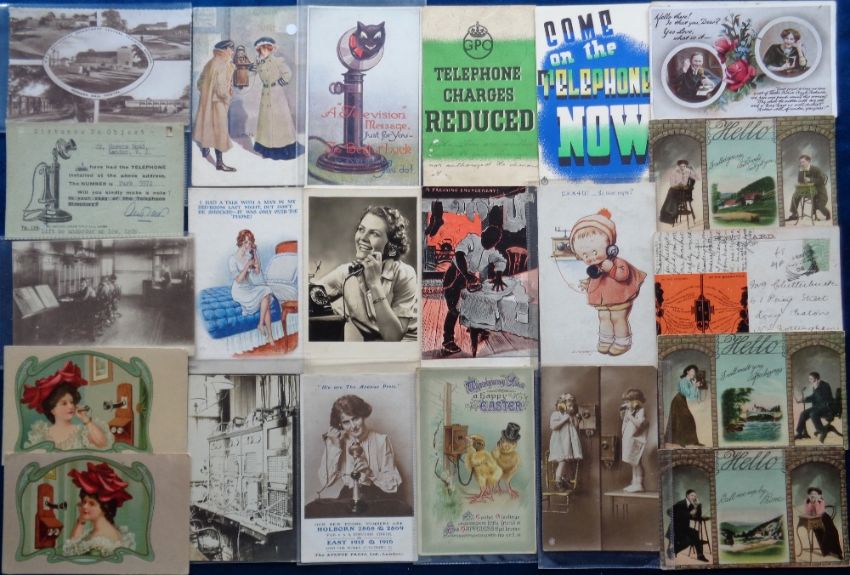 Postcards, Telephones approx 80 cards to include Post Office Engineering Training School Telephone Exchange, Hotel Continental, Wellington Exchange New Zealand, 'GPO Telephone Charges Reduced' card, glamour, greetings etc. (gen gd)