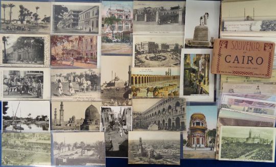 Postcards, Egypt, Cairo, 120+ cards, RPs, printed and artist drawn inc some chromolithographed Grus Aus style and souvenir cards. The Square, the Savoy Hotel, Shepheards Hotel, playing dominoes, 1937 Coronation celebrations, The Railway Station, King Fuad's Bodyguard Barracks, street scenes, processions, vehicles etc. (mixed cond, many with amr, many gd)