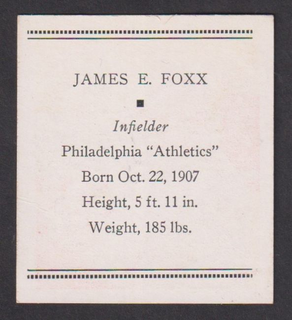 Trade card, USA, Tattoo Orbit, Baseball Card, 1933, type card, Jimmy Foxx, Philadelphia Athletic, Hall of Fame Player (gd) (1)