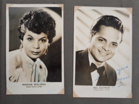 Entertainment, a 9 x 7" maroon Memory Lane album containing over 50 mid 50s to early 60s b/w photographs of actors, singers etc. Most hand signed to include Hattie Jacques, Stubby Kaye, Benny Hill, Robert Morley, George Formby, Ted Ray, David Kossoff (with hand written note), Peter Cavanagh, Wilfred and Mabel Pickles and more. All corner mounted (gd)