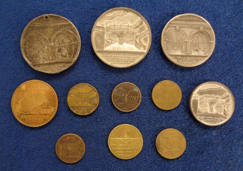 Medallions, Thames Tunnel, 4 silver coloured and 5 brass coloured medallions to commemorate the opening of the Thames Tunnel in 1843 (one for W. Griffin Silversmith Jeweller and Medallist). Together with an 1831 medallion to commemorate the laying of the first stone of the New London Bridge and 1984 medallion celebrating the opening of the Thames Flood Barrier (gen gd)