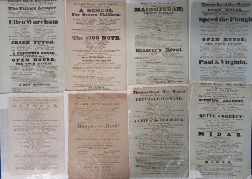 Entertainment, 26 playbills from London theatres dating from 1802-35 to comprise Covent Garden (14), Drury Lane (6), Haymarket (5) and one from the Lyceum. Actors include Elliston, Charles Kemble, Miss O’Neill, Charles Mathews, Braham, Signora Storace, John Liston etc (gen gd)