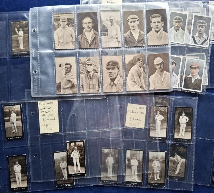 Cigarette cards, over 360 cards all slightly better Cricket related issues in part sets or odds, including Wills Cricket 1901 (19, fair/near gd), Wills Cricket 1908 (64, both large and small S), Smith Cricketers (13), Hill Caricatures Famous Cricketers (46), Gallaher Famous Cricketers 98/100 (missing 55,91 including Grace), Phillips Pinnace K sized (9), Cricketers Photographic 1924 (8), part sets Millhoff, Morris, Phillips Famous Cricketers, Hill Famous Cricketers etc (mixed condition gen fair/gd some series better than others)