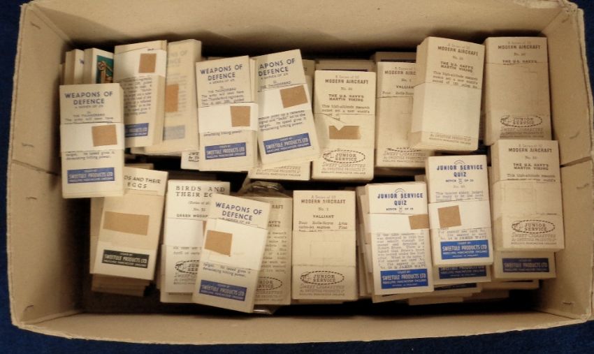 Trade cards, a collection of approx. 115 sets, only 22 different series so heavy duplication throughout including Barbers Tea, Dogs, Cadet Sweets, The Adventures of Rin Tin Tin, Treasure Hunt, Dogs, also many Sweetule sets inc. Birds & Their Eggs, Modern Aircraft, Weapons of Defence, Modern Transport, Junior Service Quiz, etc also Swettenham, Butterflies & Moths, Wild Animals etc (vg)