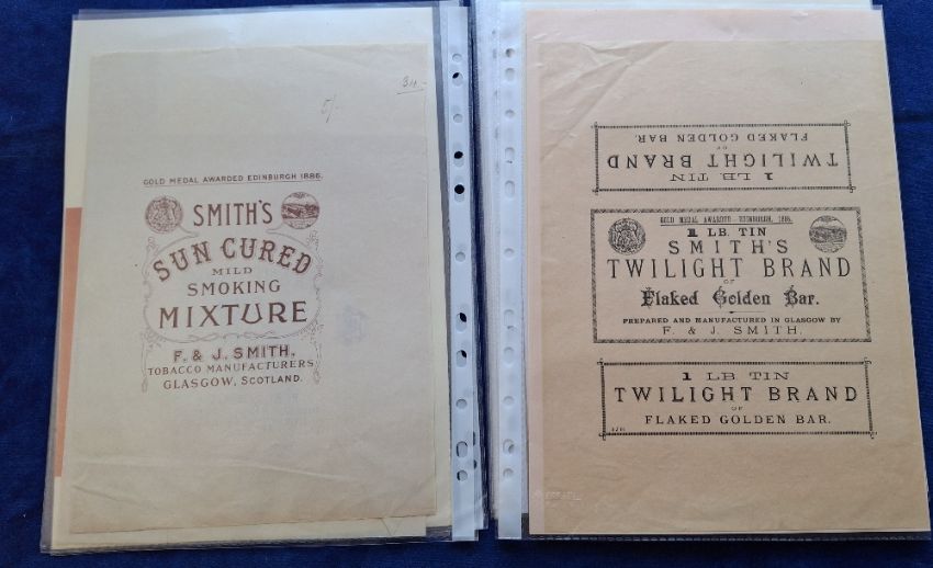 Tobacco Advertising, Smith's, selection 32 items, mostly paper labels of various sizes and designs, many brands including Sun Cured, Twilight, Glasgow, Yankee Plus, Evergreen, etc (fronts generally gd, some are loose, some lightly mounted onto card backing for display purposes)