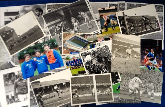 Football press photographs, Everton, a collection of approx. 100 photos, mostly b/w, various sizes, mostly 1990's, showing players in action, teamgroups, a few managers etc, noted Adrian Heath, Andy Gray, Graeme Sharp, Peter Beardsley, Pat Nevin, Steve McMahon, Tony Cottee, Howard Kendall, Colin Harvey etc. Most with details to backs together with Steve Hale photographer stamp or label to backs, a few later reprints of earlier images. (gd/vg)