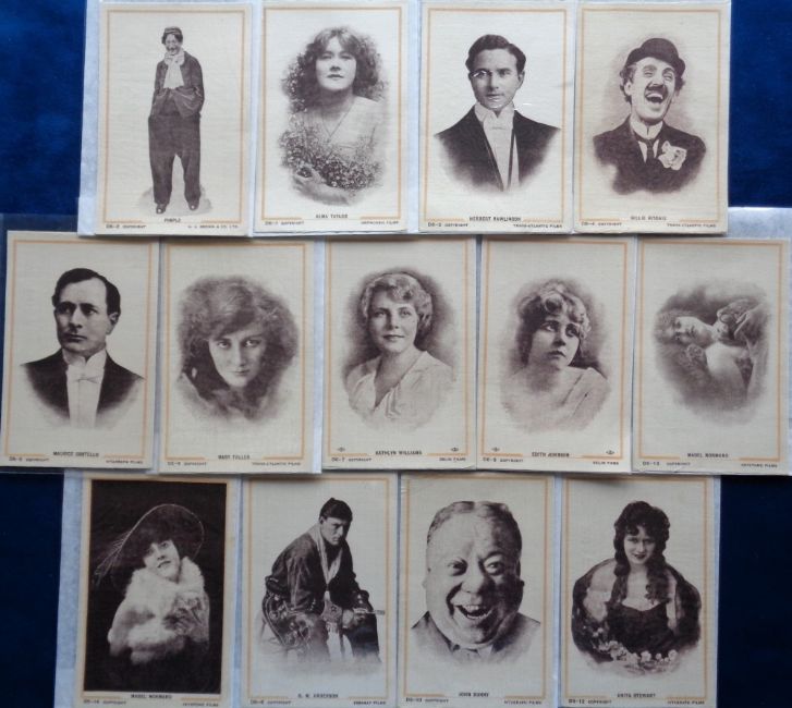 Postcards, Silk postcards of early cinema stars issued by Themans Co in 1914, to include 13 of the 14 issued. They include Alma Taylor, Pimple, Mabel Normand, Herbert Rawlinson, Billie Ritchie, Mary Fuller, G.M. Anderson, Anita Stewart, John Bunny etc. (gd)