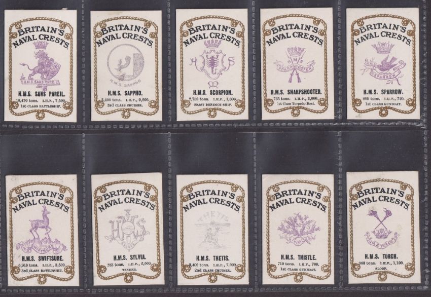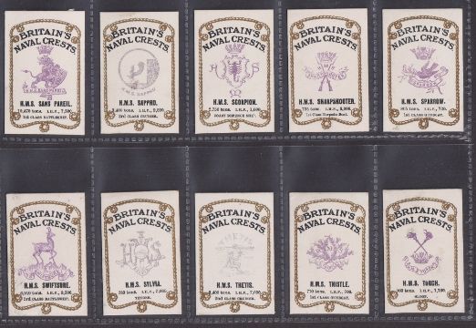 Cigarette cards, Anon, Britain's Naval Crests, 44 cards (3 with slight back damage, most with light glue staining to back, fair/gd)