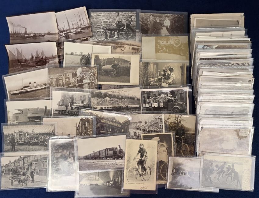 Postcards and Photographs, Transportation, approx. 145 items, showing various forms of travel to include cycling, lorries, motor cars, trams, carts, rail, bath chair, shipping, paddle steamers etc. Crashed motor car, TS Queen Mary II, Rail Motor LB & SC Ry West Croydon & Epsom Downs, Tram Car Accident Swindon 1906 (mixed condition, gen gd)