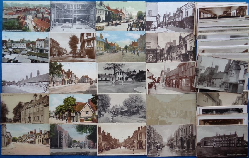 Postcards, Hitchin, 125+ cards, mainly RPs and printed to include the Market Square, Bancroft, The Sun Hotel, The Churchyard, The Priory, The Girls Grammar School, The Boys Grammar School, The Convent of the Sacred Heart, boys 1913 football team, street scenes etc (gen gd)