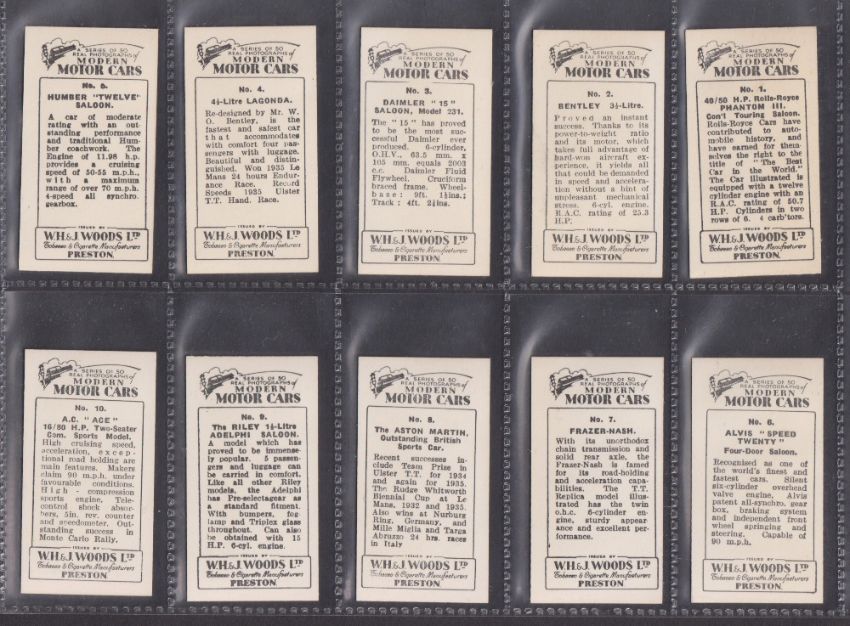 Cigarette cards, W.H. & J. Woods, Modern Motor Cars (set, 50 cards) (vg)