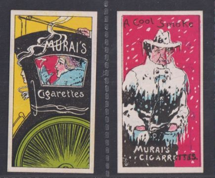 Cigarette cards, Japan, Murai Bros., Phrases & Advertisements (Back in blue with factory image) two cards, Girl Smoking in Cab & 'A Cool Smoke' (gd/vg) (2)