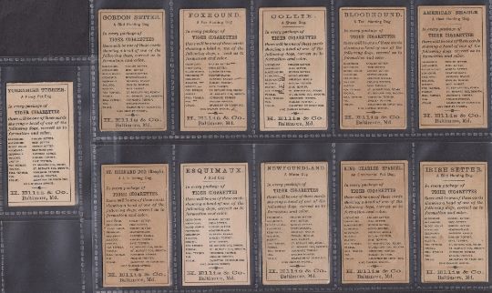 Cigarette cards, USA, H Ellis & Co, Breeds of Dogs, (inscribed 'Tiger Cigarettes mixed captions') 11 cards, American Beagle, Bloodhound, Collie, (initials stamped to back) Foxhound, Gordon Setter, Irish Setter, Kings Charles Spaniel, Newfoundland, Esquimaux, St. Bernard Dog (Rough) & Yorkshire Terrier (most with toning/light staining, other minor faults, fair/gd)